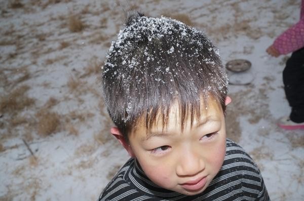 1月18日早上,河北省保定市南沟头村,越野跑结束后,雪花落在一名孩子汗湿的头发上。