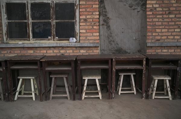 1月17日,河北省保定市南沟头村,摔跤武馆里的旧课桌。这是保定市清苑区第二中学4年前捐赠给白鹤江的,平日里,孩子们放学后会在这写完作业再一起练习摔跤。白鹤江有时会去周边学校免费教学,了解到他的故事,学校也愿意为摔跤武馆提供力所能及的帮助。近年来,有不少短视频博主造访这里,带来流量的同时,也一定程度改善了孩子们的训练环境。