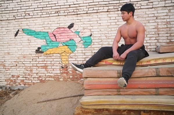 1月18日,河北省保定市南沟头村,训练结束后,18岁的郭宇航坐在软垫上,他身后的墙上绘有两名古装少年练习保定快跤的壁画。保定快跤是中国式摔跤的重要流派之一,距今已有600余年历史,以快速技术为核心特征。其“强身防身、涵养意志”的精神内核流传至今。