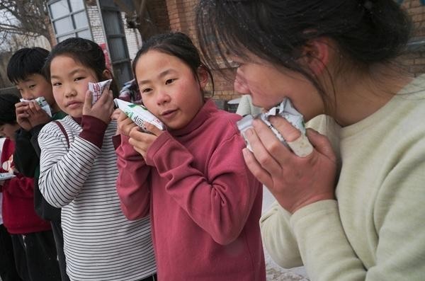 1月18日,河北省保定市南沟头村,训练结束后,10岁的冯韵雅(右二)和其他学员们用热牛奶捂着冻红的脸蛋。目前在武馆学习的孩子有四成是女孩,除了达到强身健体的目的,她们还能运用在这里学到的摔跤和武术技巧保护自己。