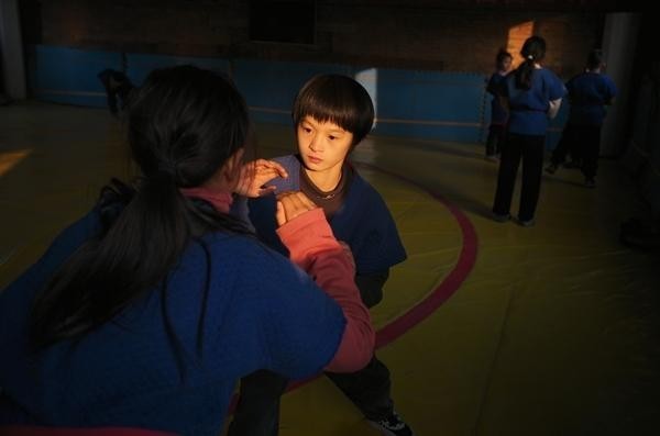 1月18日,河北省保定市南沟头村,10岁的刘宇灿在武馆里与另一名学员过招。她练习摔跤已有5年多,家住在离这不远的北沟头村。