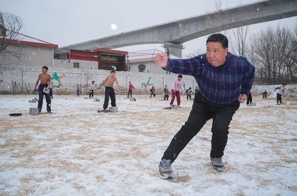 1月18日,河北省保定市南沟头村,白鹤江在武馆外的空地上指导孩子们锻炼体能。后方是正在修建中的雄忻高铁。
