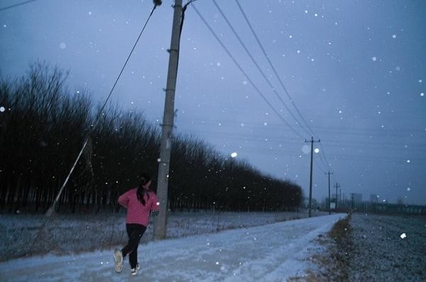 1月18日清晨,河北省保定市南沟头村,一名女孩在村道上迎雪奔跑。白鹤江采用循序渐进的训练方式,将孩子们按年龄分组,每周一次,沿着武馆跑4-8公里不等,训练肺活量和耐力,为良好的身体打下“地基”。