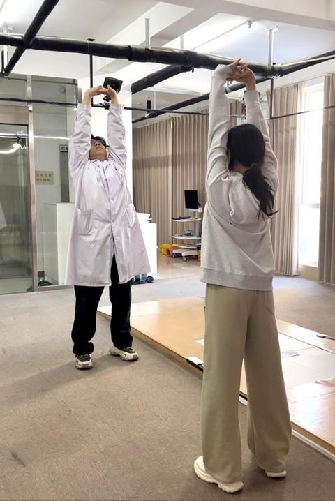 这一次来到望京医院运动医学三科,徐天勤在医生指导下学习了“双手托天理三焦”和五禽戏中的鹿式。“双手上托的动作可以拉伸躯干两侧的少阳经脉,疏通三焦气机,促进气血运行。同时,脊柱的纵向拉伸有助于维持脊柱的正常生理曲度,增强脊柱周围肌肉的力量和柔韧性。这一动作可以有效拉伸胸腰筋膜,增强核心稳定性,对预防和改善脊柱侧弯有积极作用。”金哲峰解释。