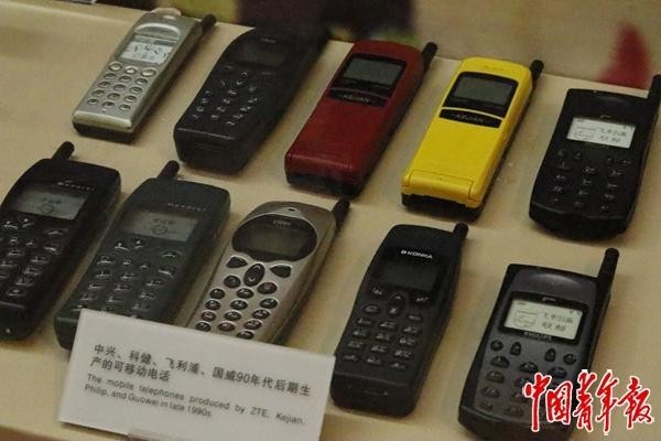 展柜里20世纪90年代后期生产的可移动电话