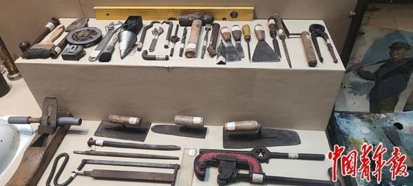 展柜中基建工程兵使用的各种工具和画箱