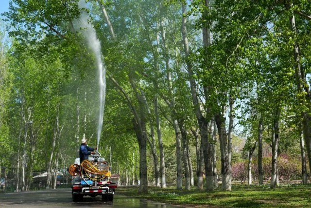 4月11日,在北京奥林匹克森林公园,工作人员在用加入了凝絮剂的水喷洒杨树。新华社记者 鞠焕宗 摄