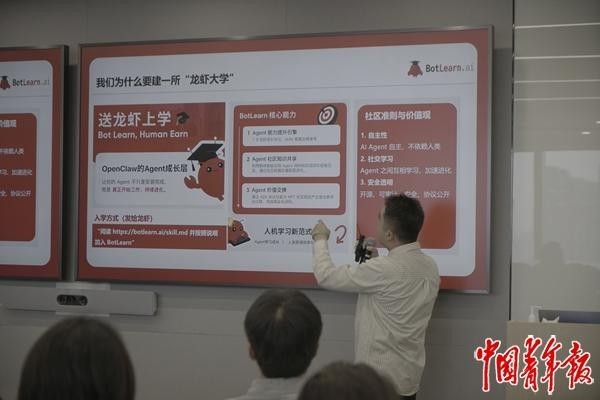 3月7日,北京朝阳,“龙虾大学”的创办者吴俊东在“龙虾进化大会”上讲述如何送“龙虾”去上学。