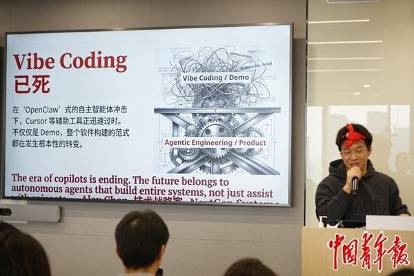 3月7日,北京朝阳,年轻的创业者杨天润在分享对OpenClaw的看法,PPT上展示着:Vibe Coding已死。