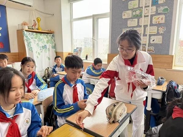 中国人民大学附属中学分校集团学生宣讲员近日走进中国农业科学院附属小学进行总体国家安全观主题宣讲。图为一位宣讲员(右一)在与小学生们进行互动。受访者供图