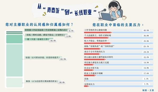 调研发现,高强度直播节奏、持续内容输出压力及夜间工作模式,给一些受访者带来身心负担。部分受访者面临变现渠道单一、收入不稳定等问题。有人说,主播行业常被贴上“青春饭”标签,随着年龄增长、外形变化,从业者可能面临流量下滑、竞争力下降、“播不动”甚至被AI替代的职业问题。