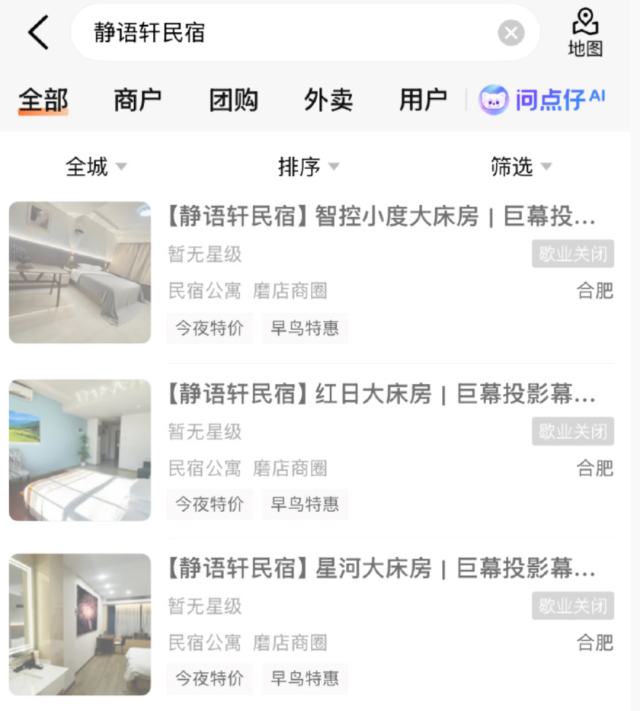 企查查APP显示,涉事民宿成立于2025年4月21日,经营范围为住宿服务。第三方平台显示,该民宿为无人自助式酒店,曾入选磨店商圈经济型酒店热门榜,目前该店已闭店歇业。