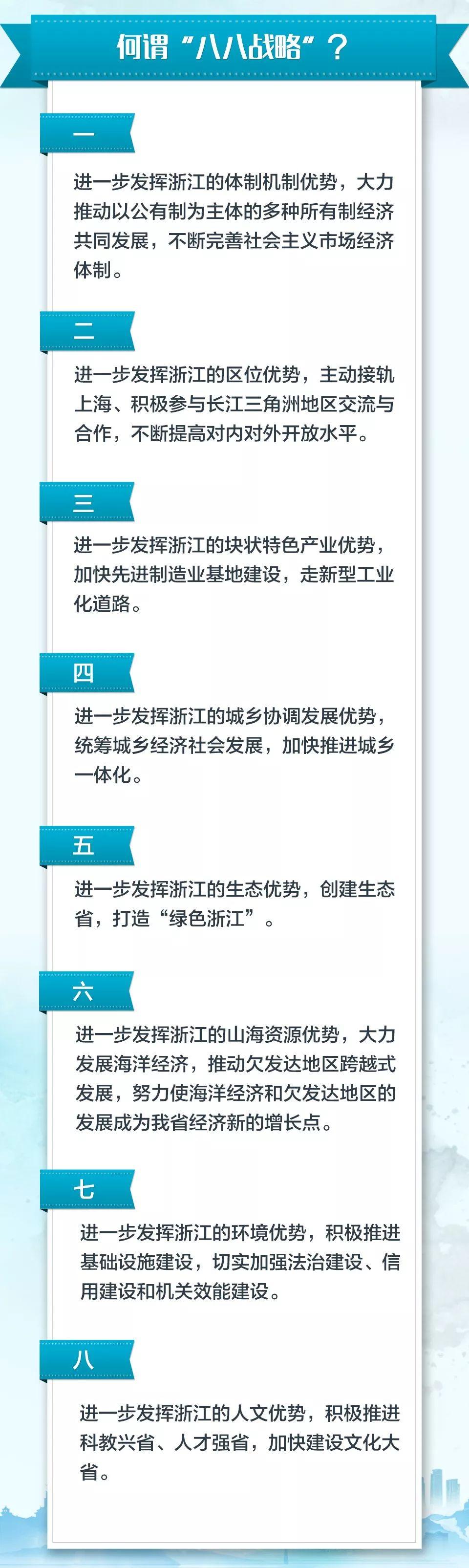 2003年7月,中共浙江省委举行第十一届四次全体(扩大)会议,时任浙江省委书记习近平作工作报告,提出浙江面向未来发展的系统方案:即进一步发挥“八个方面的优势”,推进“八个方面的举措”,简称“八八战略”。