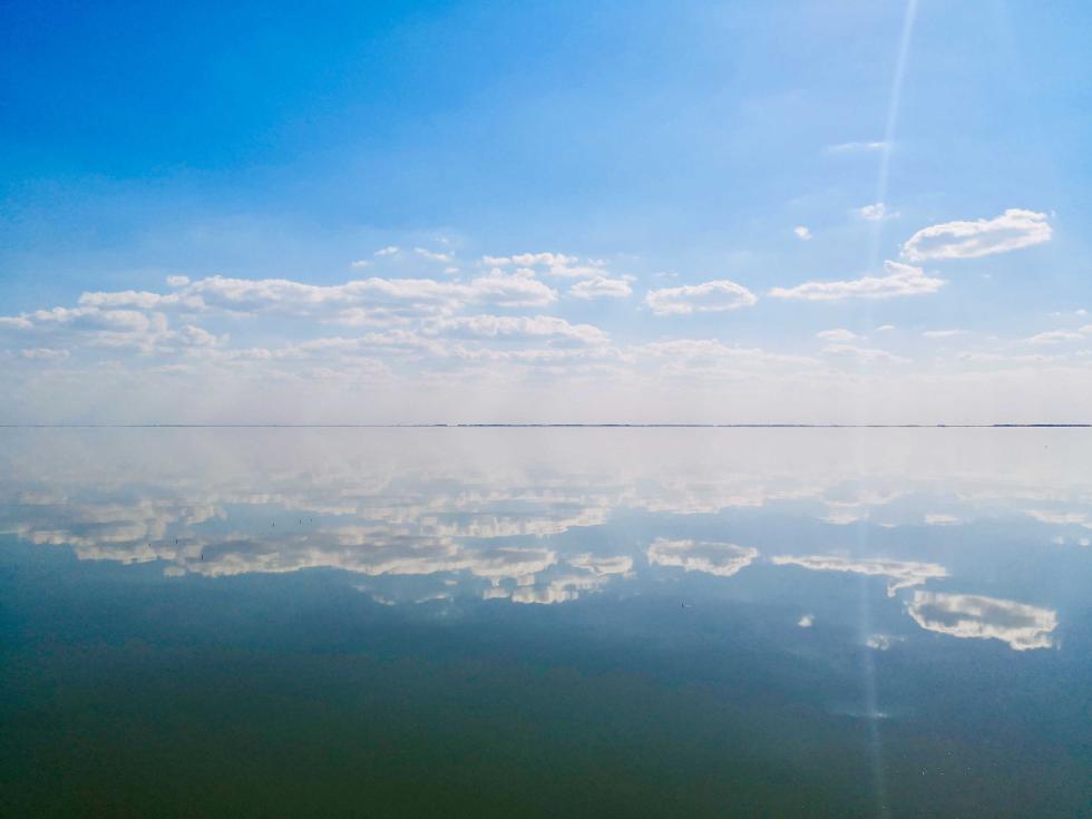 △查干湖当天湖面如镜,让人仿佛置身平行世界的交汇点。(央视记者王萌萌拍摄)