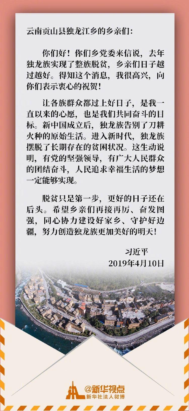这一天,习近平总书记给他们回信。总书记在信中祝贺独龙族实现整族脱贫,勉励乡亲们为过上更加幸福美好的生活继续团结奋斗。
