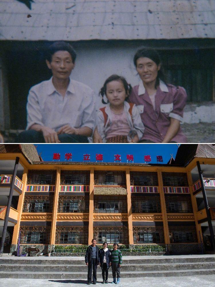 拼版照片,上图:1993年在独龙江乡小学拍摄的独龙族群众高德生、高琼先和黎英(从左到右)一家三口(资料照片);下图:2016年11月23日在独龙江乡中心小学拍摄的独龙族群众高德生、高琼先和黎英一家(从左到右)