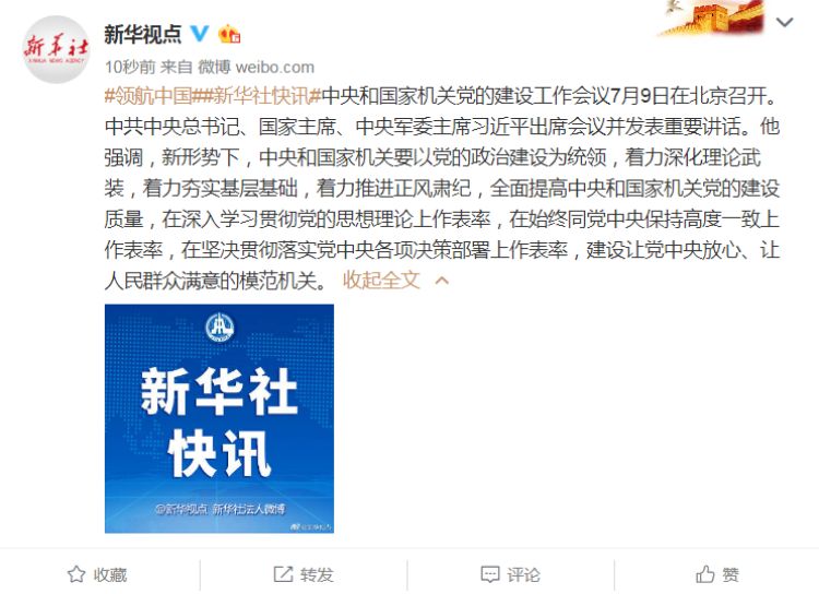 中央和国家机关党的建设工作会议7月9日在北京召开。中共中央总书记、国家主席、中央军委主席习近平出席会议并发表重要讲话。他强调,新形势下,中央和国家机关要以党的政治建设为统领,着力深化理论武装,着力夯实基层基础,着力推进正风肃纪,全面提高中央和国家机关党的建设质量,在深入学习贯彻党的思想理论上作表率,在始终同党中央保持高度一致上作表率,在坚决贯彻落实党中央各项决策部署上作表率,建设让党中央放心、让人民群众满意的模范机关。