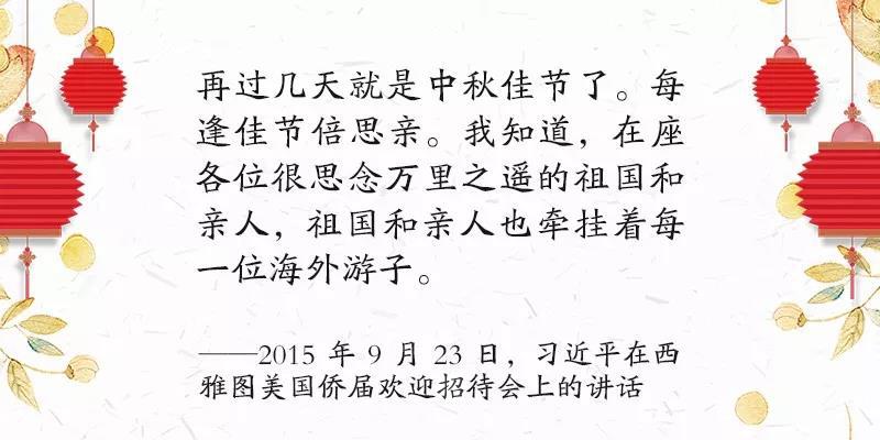“月是故乡明,人是家乡亲”。2015年中秋节前,习近平在西雅图出席美国侨界欢迎招待会。他特地为当地华人带来故乡的月饼,表达祖国人民的一点心意,欢迎大家常回家看看。
