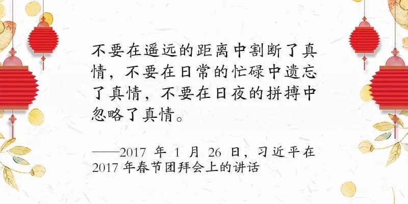 在2017年春节团拜会上,习近平连用三个“不要”提醒大家,再拼也不要遗忘了人间真情。总书记的“家常话”,关怀了多少四处奔波的追梦者,点醒了多少埋头忙碌的职场人。曾几何时,距离太远、工作太忙、日夜打拼等等,经常成为人们忽略亲情的借口。血脉亲情,隔山隔水隔不断,团圆和睦是中国人传统而朴素的愿望,总书记提醒人们要格外珍视至亲至美的人间真情。