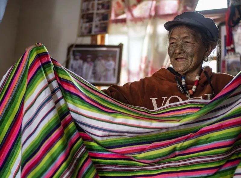 △2019年4月21日,独龙族老人李文仕在家里展示她亲手织的独龙毯