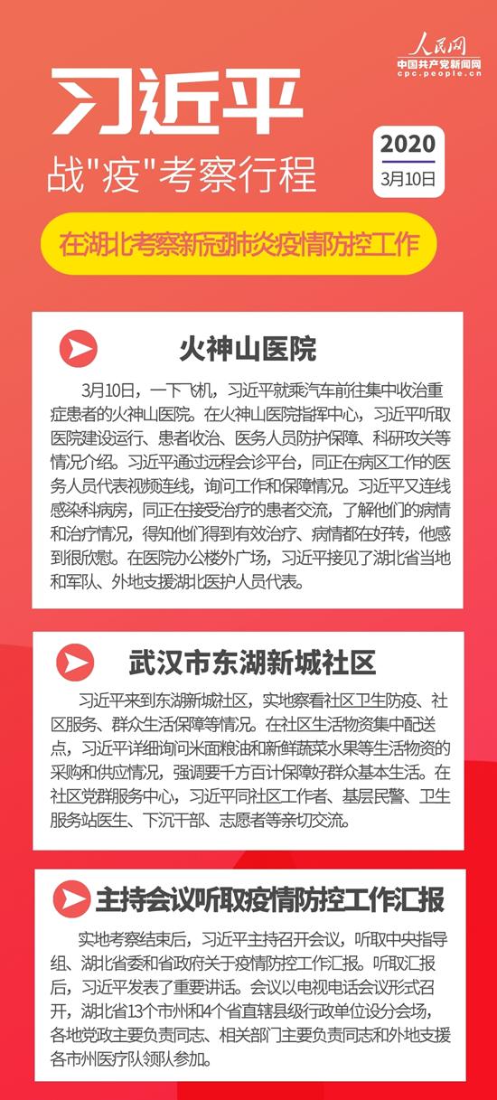 3月10日,在抗击新冠肺炎疫情的关键时刻,习近平专门赴湖北省武汉市考察疫情防控工作,看望慰问奋战在一线的广大医务工作者、解放军指战员、社区工作者、公安干警、基层干部、下沉干部、志愿者和患者群众、社区居民。