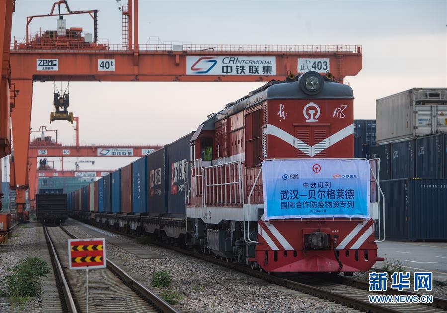 开往塞尔维亚贝尔格莱德的中欧班列(武汉)准备从吴家山站驶出,该班列满载3500立方米、294.42吨国际合作防疫物资,支援塞尔维亚及周边国家抗击新冠肺炎疫情(5月9日摄)。新华社记者 肖艺九 摄