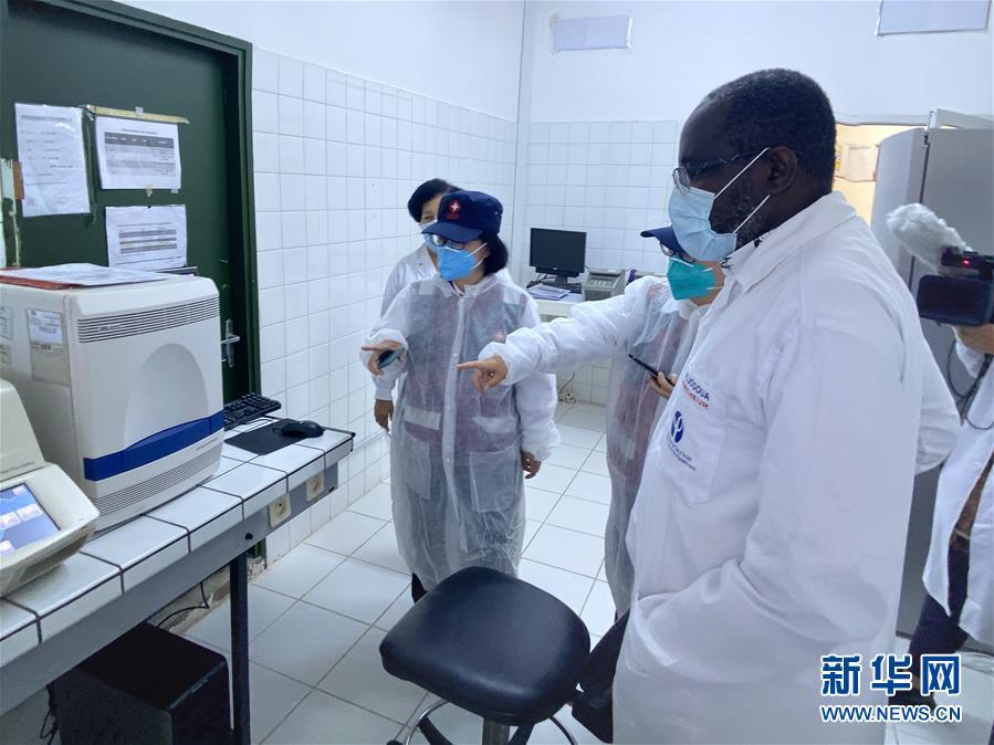 在科特迪瓦经济首都阿比让,中国抗疫医疗专家组在巴斯德研究所病毒检测实验室与科特迪瓦专家交流(5月5日摄)。新华社发(梁樑 摄)