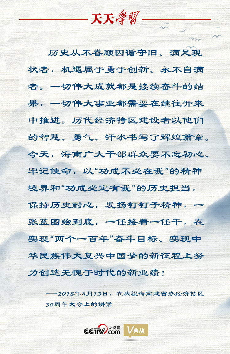 2018年4月13日,在庆祝海南建省办经济特区30周年大会上,习近平总书记充分肯定经济特区建设的历史功绩,深刻总结经济特区建设的宝贵经验,提出在新时代新起点上继续把全面深化改革推向前进,强调要以“功成不必在我”的精神境界和“功成必定有我”的历史担当,保持历史耐心,发扬钉钉子精神,一张蓝图绘到底,一任接着一任干,为新时代进一步办好经济特区指明了前进方向、提供了根本遵循。