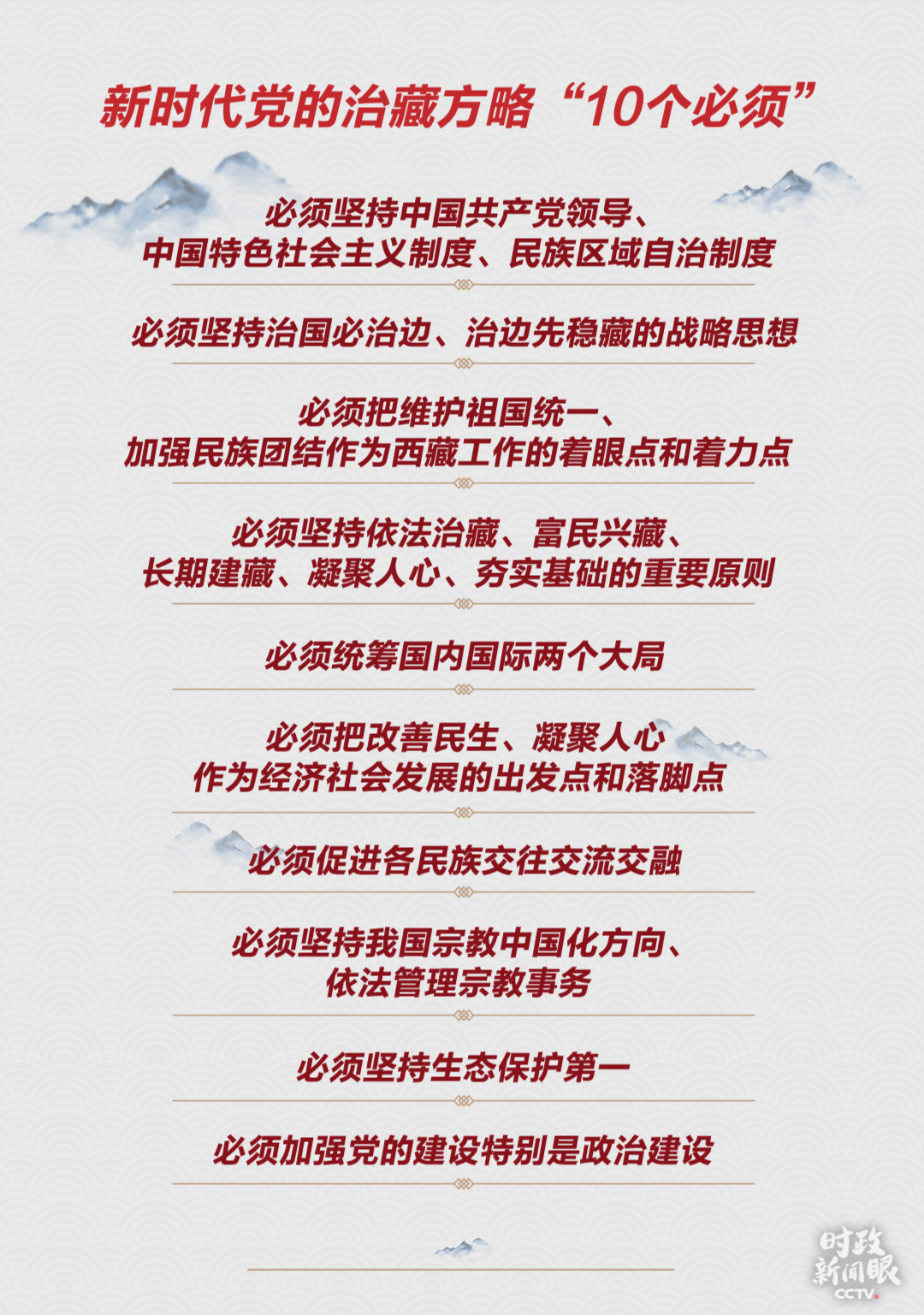 在五年前的中央第六次西藏工作座谈会上,习近平指出,西藏工作的着眼点和着力点必须放到维护祖国统一、加强民族团结上来。在今年的座谈会上,总书记再次强调,西藏工作必须坚持以维护祖国统一、加强民族团结为着眼点和着力点。这一要求也被列为新时代党的治藏方略“10个必须”之一。
