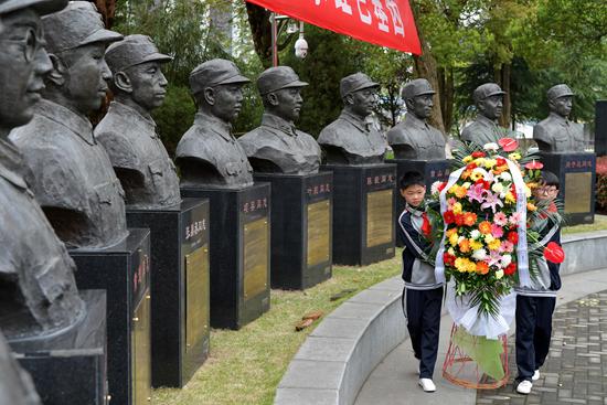 在江西省南昌市新四军军部旧址纪念广场,南昌市书院小学学生向革命先辈的塑像敬献花篮(2019年4月4日摄)。新华社记者 彭昭之/摄