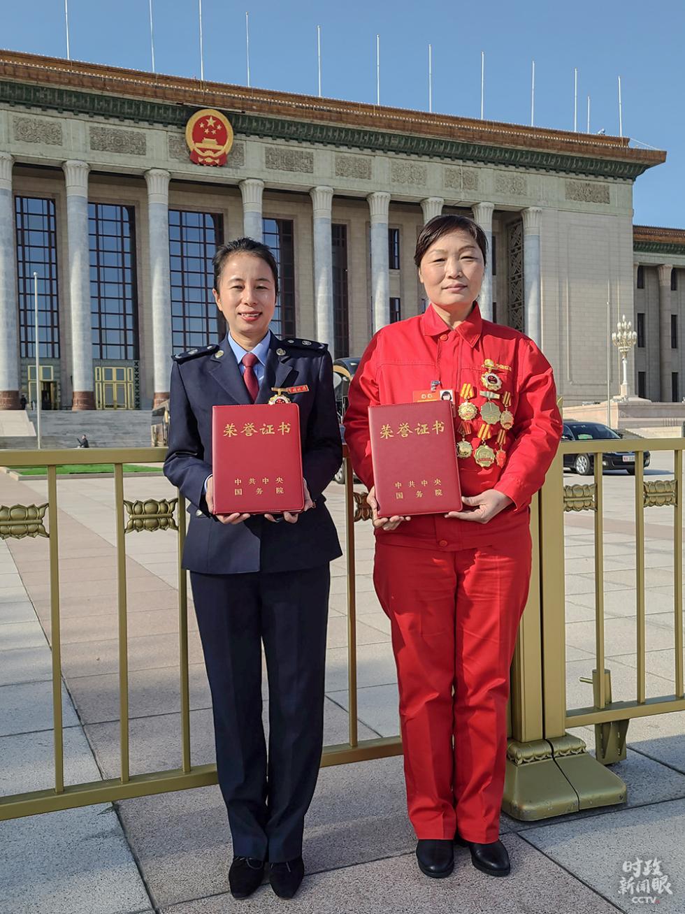 △全国劳动模范刘丽(右)与全国先进工作者刘双燕(左)(总台央视记者赵化拍摄)