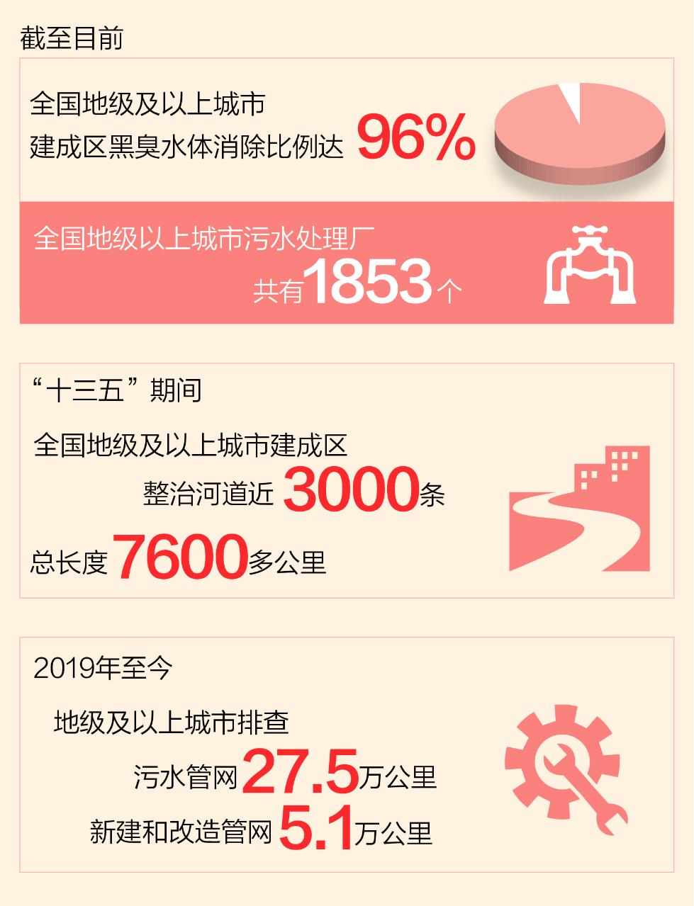 “十三五”期间,全国地级及以上城市建成区整治河道近3000条,总长度7600多公里。截至目前,全国地级及以上城市建成区黑臭水体消除比例达96%。2019年至今,全国地级及以上城市排查污水管网27.5万公里,新建和改造管网5.1万公里。