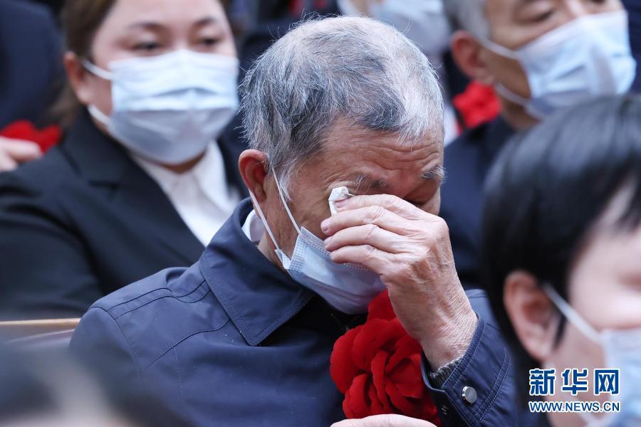 2月25日,全国脱贫攻坚总结表彰大会在北京人民大会堂隆重举行。会上,“全国脱贫攻坚楷模”黄文秀的父亲黄忠杰替女儿戴上了大红花,并洒下泪水。黄文秀生前为广西壮族自治区百色市委宣传部派驻乐业县新化镇百坭村驻村第一书记,2019年6月17日牺牲在脱贫攻坚一线,献出了年仅30岁的宝贵生命。新华社记者 刘彬 摄