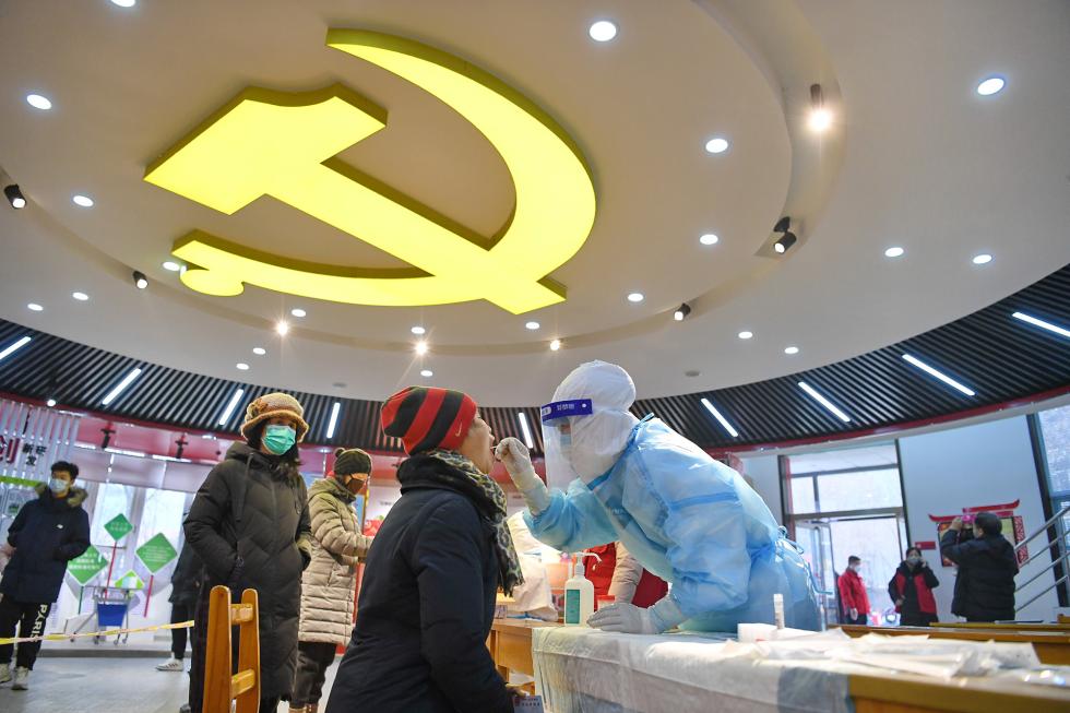↑2021年1月25日,医护人员在石家庄市裕华区一小区为居民进行核酸采样。