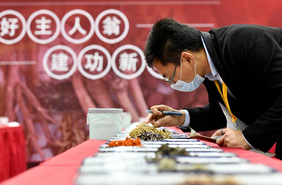 ↑2020年10月15日,全国中药传统名堂职业技能竞赛决赛在天津举行,来自全国中药材鉴别领域37家传统名堂的75名选手参加。这是选手在参加中药材识别和真伪鉴别考试。