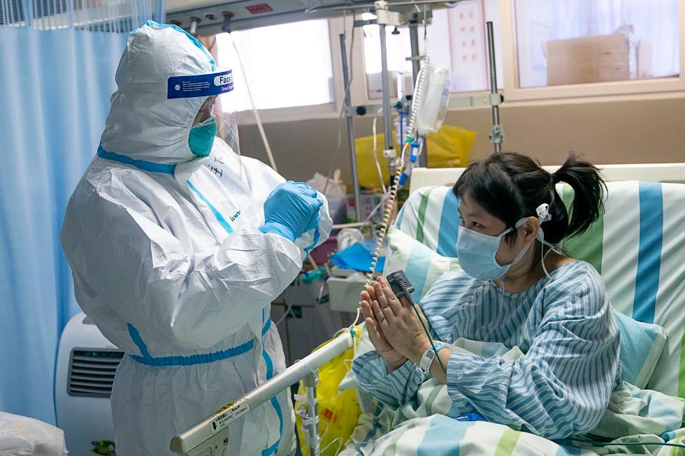 ↑2020年4月24日,在位于武汉的华中科技大学同济医学院附属协和医院西院,医务人员在护理核酸检测结果转阴的新冠肺炎病人。