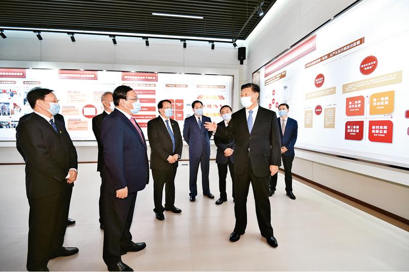 2020年11月12日,浦东开发开放30周年庆祝大会在上海市举行。中共中央总书记、国家主席、中央军委主席习近平在会上发表重要讲话。这是当天上午,习近平等参观“在国家战略的引领下——浦东开发开放30周年主题展”。 新华社记者 殷博古/摄