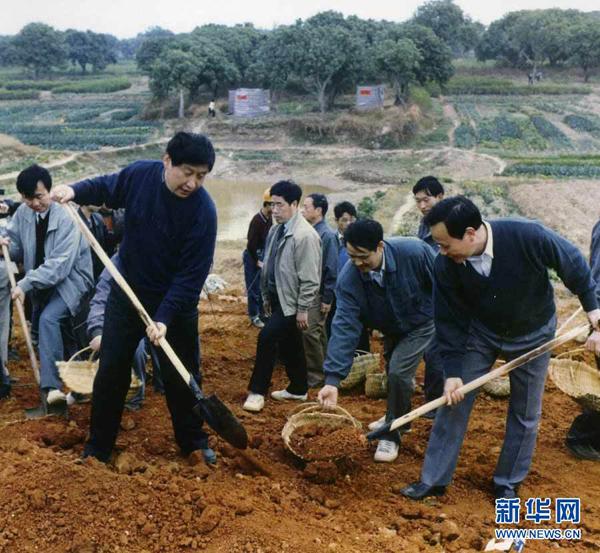 这是1995年12月,时任福建省委副书记、福州市委书记的习近平(前排左一)在闽侯参加闽江下游防洪堤加固工程的劳动。新华社发