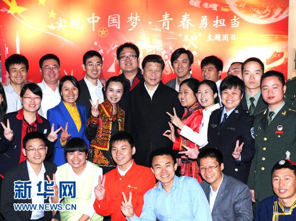 2013年5月4日,中共中央总书记、国家主席、中央军委主席习近平来到中国航天科技集团公司中国空间技术研究院,同各界优秀青年代表座谈并发表重要讲话。这是座谈会前,习近平和在展厅参观的优秀青年代表合影。新华社记者 饶爱民 摄