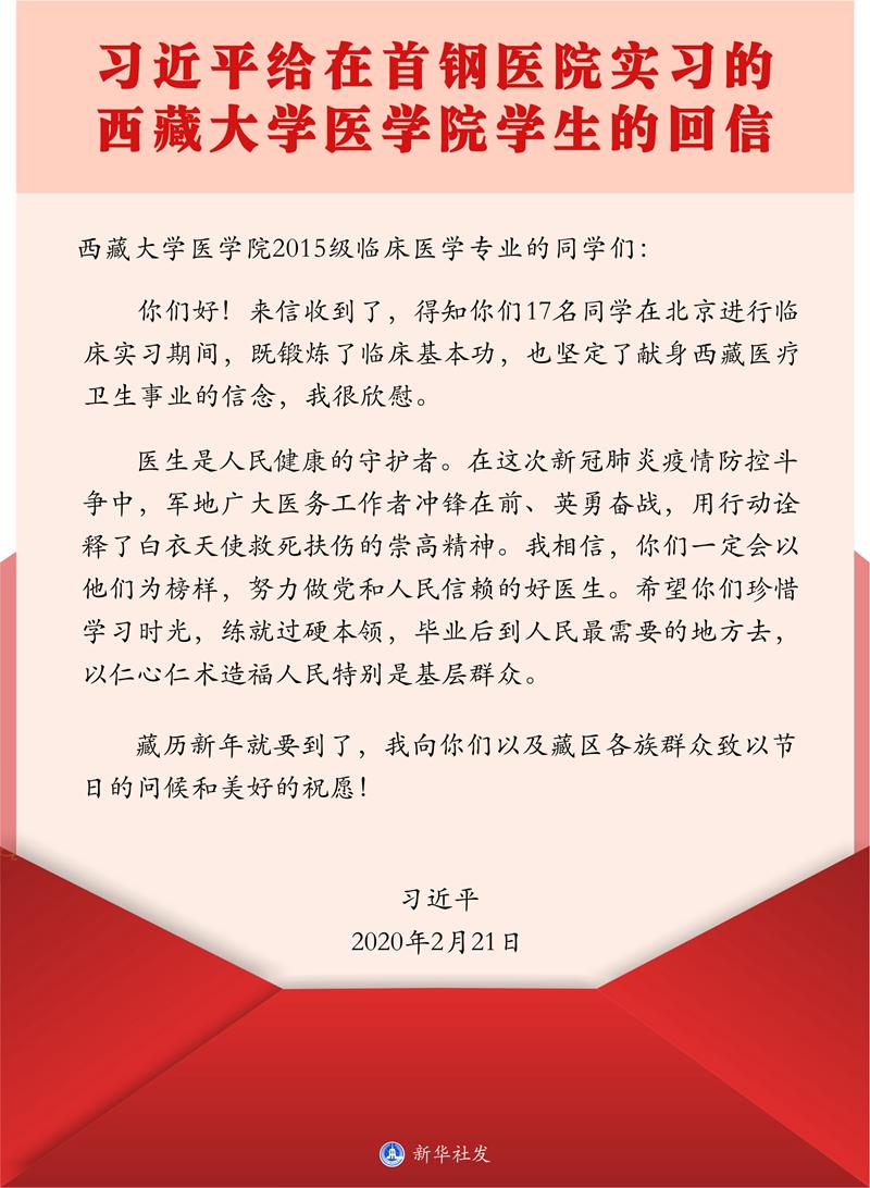 ——2020年2月21日,习近平总书记给正在北京大学首钢医院实习的西藏大学医学院学生的回信。2019年6月,在对口支援高校北京大学医学部的安排下,西藏大学医学院2015级临床医学专业本科班的17名学生来到首钢医院,开始为期11个月的临床实习。这些学生给习近平总书记写信,汇报了实习以来的收获和感悟,表达了对党和国家的感恩之情,以及学好本领后报效祖国、建设家乡的决心。