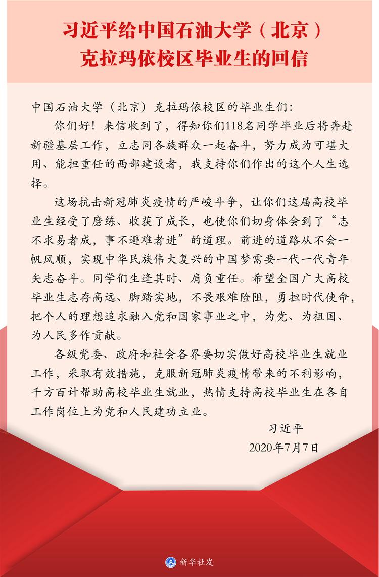 ——2020年7月7日,习近平总书记给中国石油大学(北京)克拉玛依校区毕业生的回信。中国石油大学(北京)克拉玛依校区2016年开始招生,435名首届毕业生来自全国16个省份,目前总体就业率接近85%,其中118人选择到新疆基层工作。这118名毕业生给习总书记写信,汇报了大学四年学习和思想上的收获,表达了扎根西部、建设边疆的坚强决心。