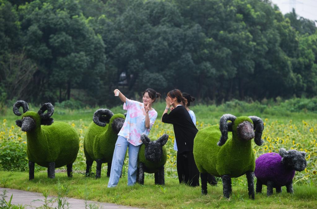 2021年8月10日,几名游客在浙江湖州南山村特色度假小镇的向日葵花田旁自拍留影。新华社记者 徐昱 摄