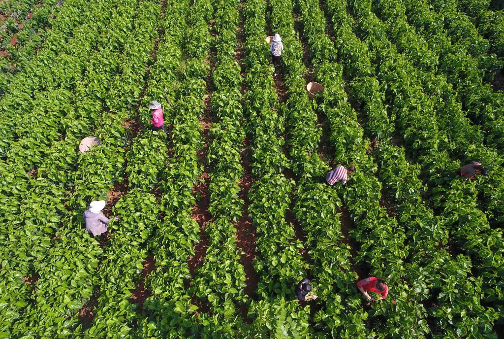 云南省寻甸县金所街道草海子村的农妇在采摘蚕桑叶(2020年5月16日摄,无人机照片)。新华社记者 杨宗友 摄
