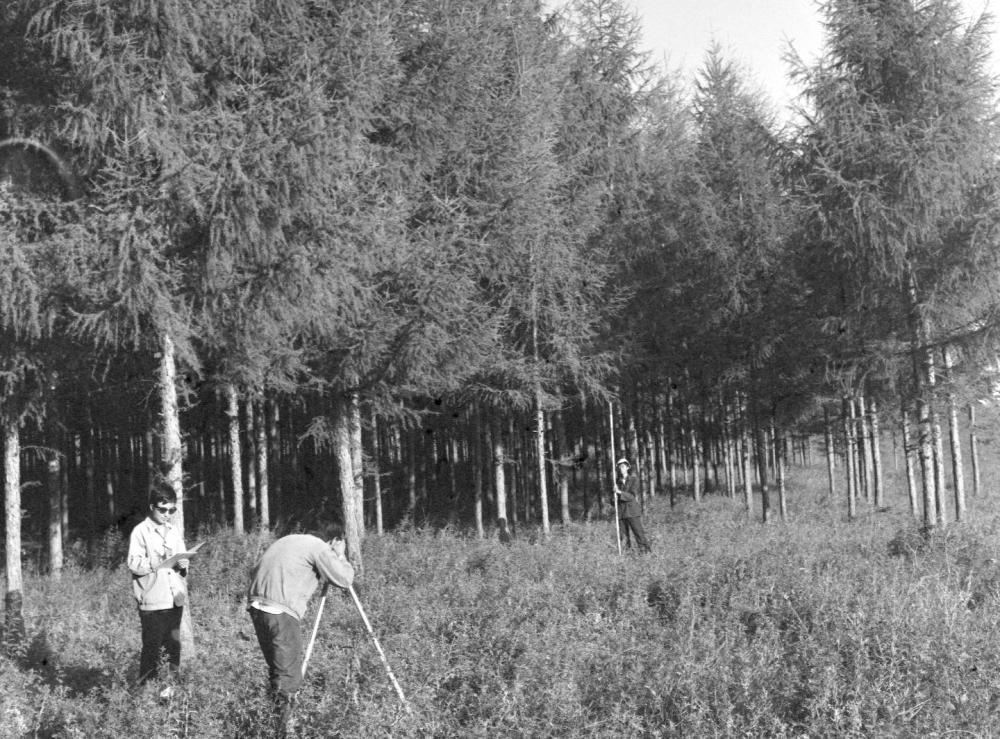 ↑林业调查队员在塞罕坝林场进行森林调查(20世纪80年代资料照片)。