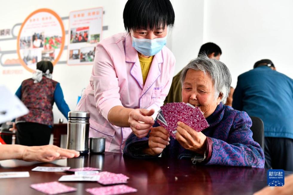 在山东省东营市垦利区杨庙社区养老服务中心,工作人员陪老人打扑克(10月18日摄)。新华社记者 郭绪雷 摄