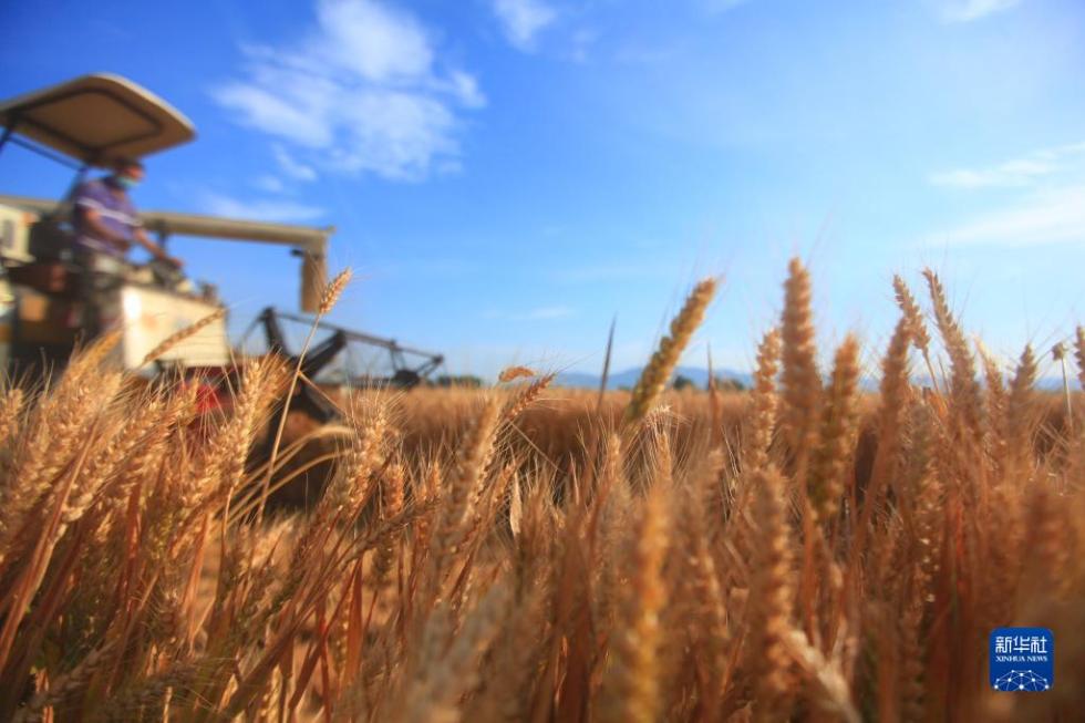 收割机在山东省临沂市平邑县的麦田里收割小麦(6月8日摄)。新华社发(武纪全 摄)