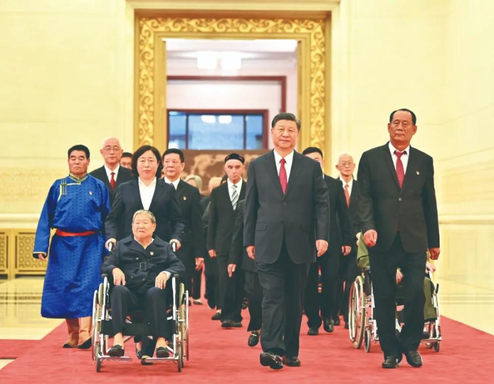 2021年6月29日,庆祝中国共产党成立100周年“七一勋章”颁授仪式在北京人民大会堂金色大厅隆重举行。习近平同“七一勋章”获得者一同步入会场。新华社记者 李涛摄