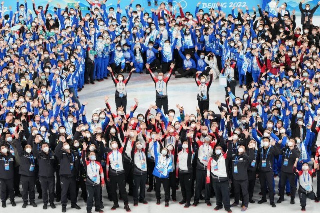 2月20日,北京冬奥会举行花样滑冰表演滑工作人员和志愿者在表演滑结束后合影留念。新华社记者王毓国摄