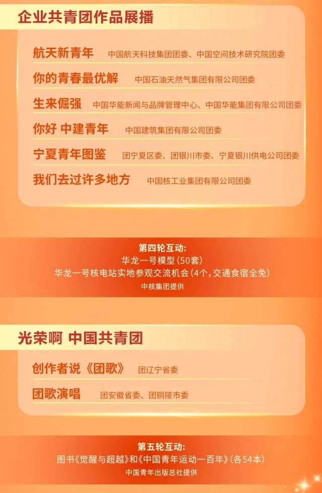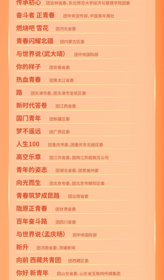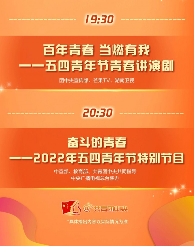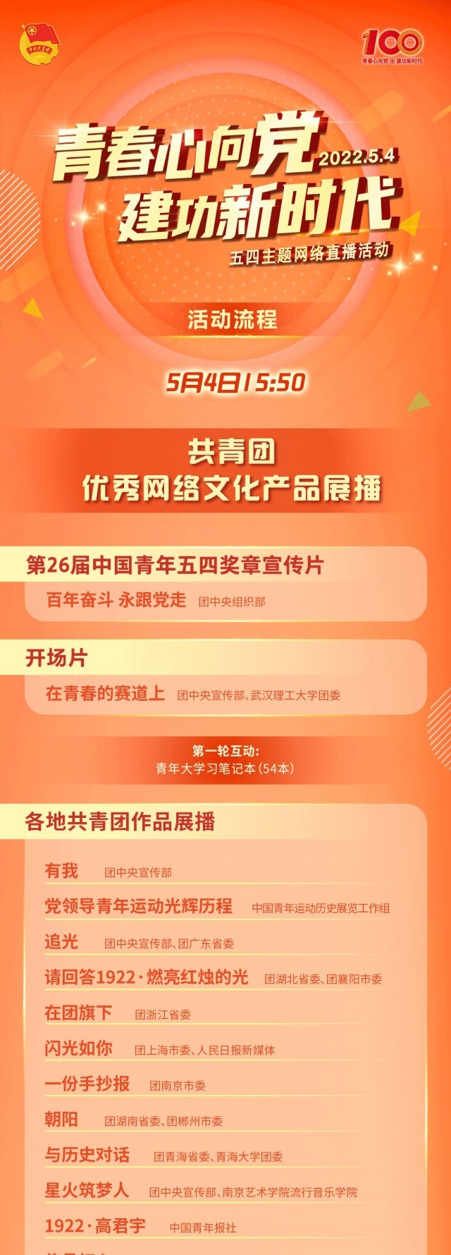 五四青年节在这个属于青年人的节日里庆祝中国共产主义青年团成立100周年团团特别策划了“青春心向党 建功新时代”五四主题网络直播活动整场活动将从今天15:50开始分为共青团优秀文化产品展播“百年青春 当燃有我”——五四青年节青春讲演剧“奋斗的青春”——2022年五四青年节特别节目三个部分的内容一键预约看全程!