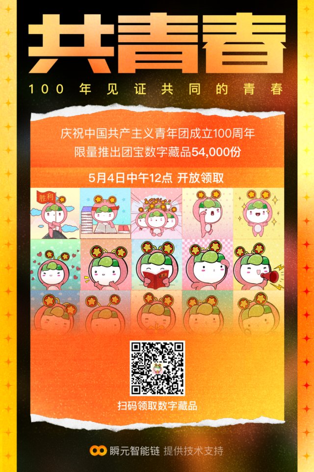 100年见证共同的青春为庆祝中国共产主义青年团成立100周年限量推出团宝数字藏品5月4日中午12点扫描海报下方二维码领取你的定制版团宝数字藏品吧